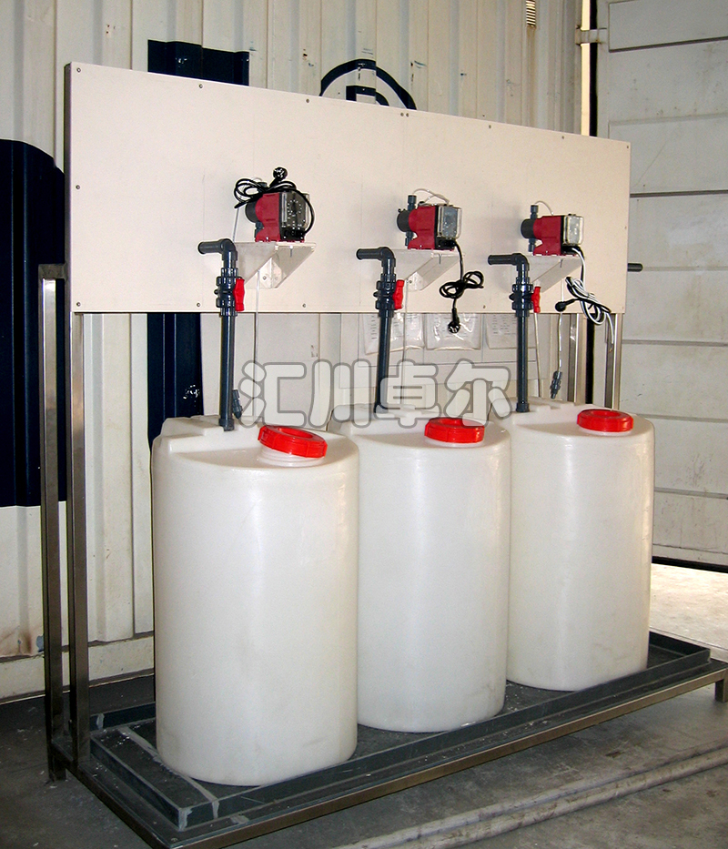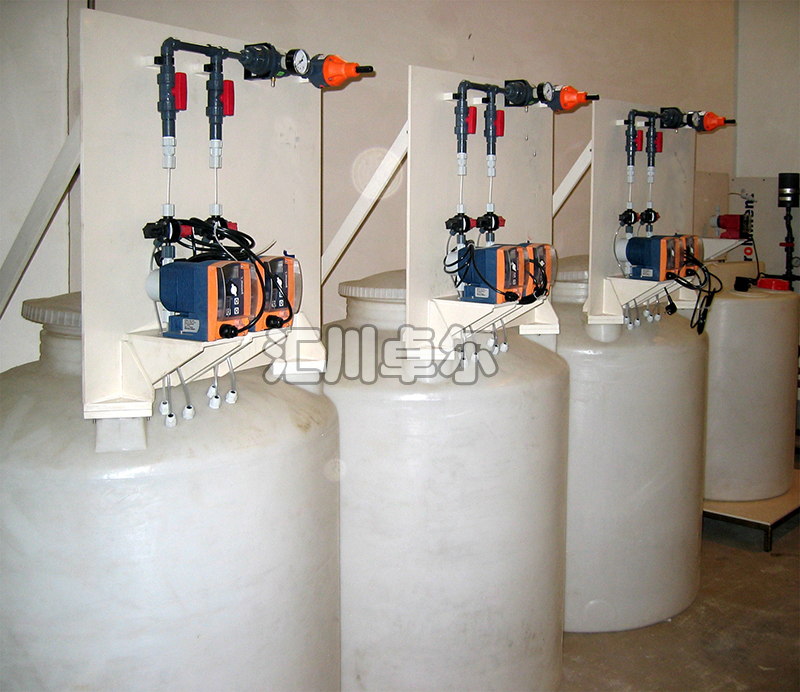 在染料投加和水处理的某些场合,计量泵加药量一般小于1000 l/h,首先应考虑将泵直接放置在药桶上。普加药桶上预留有一台计量泵、一台搅拌器的连接位置,计量泵、流量监视、带液位开关的底阀、药桶、排泄阀、搅拌器等均可直接集成到加药桶上。其他配件除注射阀外如脉冲阻尼器、背压阀、控制仪表等集成在一块PVC板上,分别放置在不同的区域。